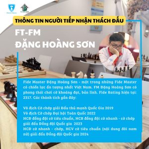 ????‍♂️ Người tiếp nhận thách đấu: Fide Master Đặng Hoàng Sơn – một trong những Fide Master có chiến lực ấn tượng nhất Việt Nam. FM Đặng Hoàng Sơn có phong thái chơi cờ khoáng đạt, bản lĩnh. Fide Rating: 2317 – các huy chương trong 3 năm gần đây…